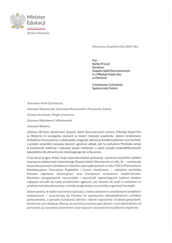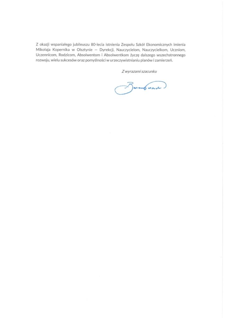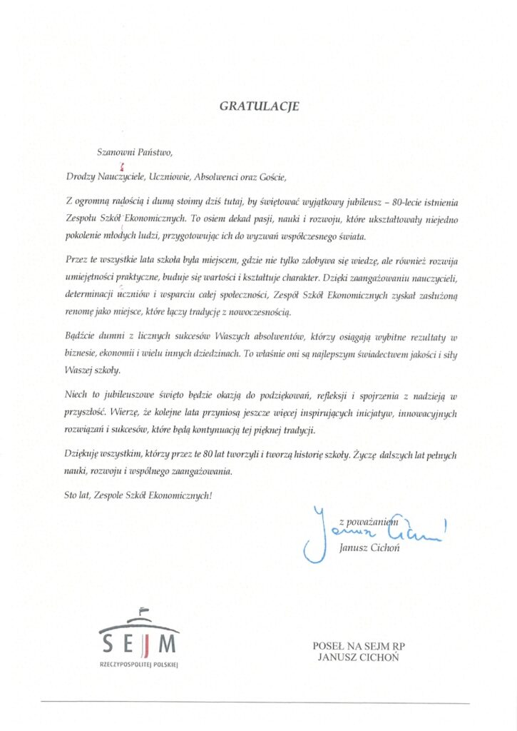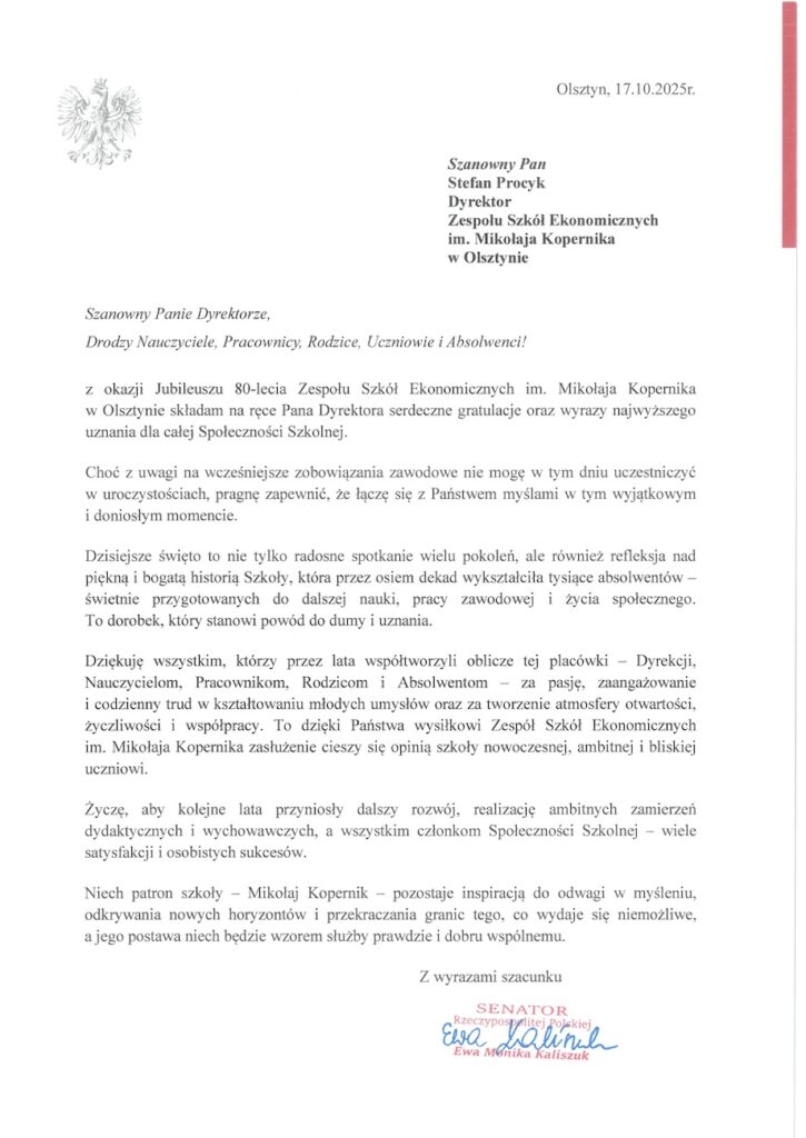 Nie wszyscy zaproszeni goście mogli osobiście uczestniczyć w uroczystości jubileuszu 80-lecia naszej szkoły. Mimo to pamiętali o nas i przesłali serdeczne listy gratulacyjne.
